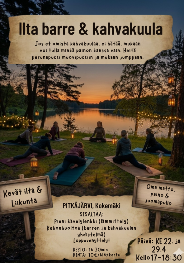 Aloitamme pienellä kävelylenkillä, jonka jälkeen jatkamme jumpan merkeissä. Kehonhuolto sisältää barrea sekä kahvakuulaa.