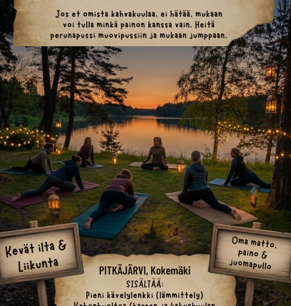 Huhtikuussa kaksi viimeistä keskiviikkoa. Ilta liikuntaa Pitkäjärvellä. Aloitamme pienellä kävelylenkillä, jonka jälkeen jatkamme jumpan merkeissä. Kehonhuolto sisältää barrea sekä kahvakuulaa. Eikä hätää, jos ei omaa kahvakuulaa ole, mukaan voi tulla ilman painoa tai vaikka perunapussin…