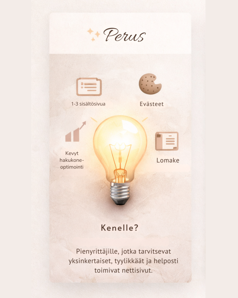 Perus-paketti on täydellinen valinta, kun haluat yrityksellesi selkeän ja tyylikkään digitaalisen käyntikortin ilman turhaa monimutkaisuutta. Tämä paketti antaa sinulle kaiken olennaisen: sivut, jotka näyttävät hyvältä, toimivat sujuvasti ja löytyvät Googlesta.