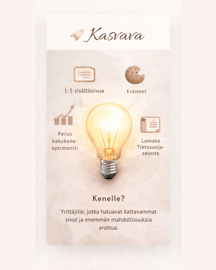 Kasvava-paketti on suunniteltu sinulle, joka haluat enemmän kuin pelkän käyntikorttisivun. Kun liiketoimintasi kasvaa, myös nettisivujen pitää pysyä mukana ja tässä paketissa siihen on kaikki valmiudet.