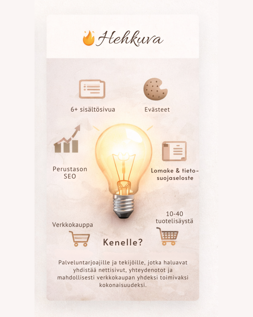 Hehkuva-paketti on sinulle, joka haluat nettisivuiltasi enemmän tehoa, näkyvyyttä ja mahdollisuuksia kasvaa. Tämä kokonaisuus yhdistää laajemmat sivut, toiminnallisuuden ja mahdollisuuden myydä suoraan verkossa.