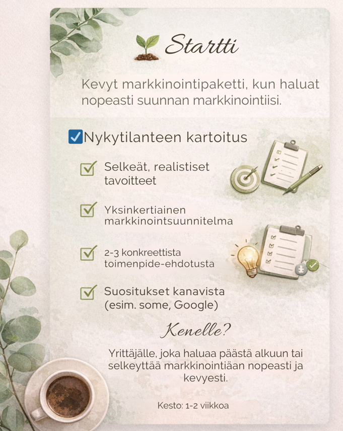 Kevyt ja helposti ostettava paketti sinulle, joka haluat nopeasti suunnan markkinointiisi ilman isoa sitoutumista.