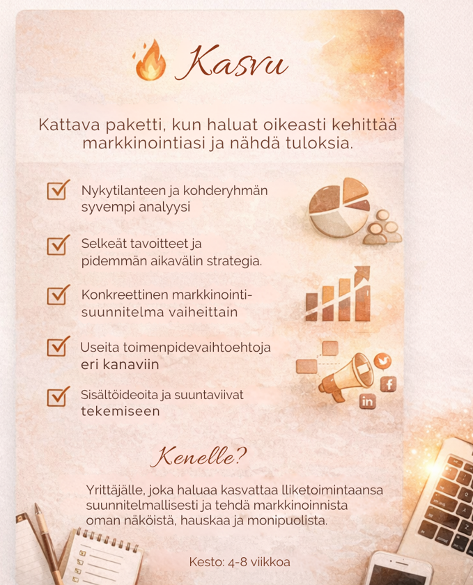 Kattavampi paketti sinulle, joka haluat oikeasti kehittää markkinointiasi ja nähdä tuloksia.
